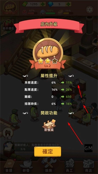 4、店铺完成升级后,来客速度、點單速度等属性得到提升,同时开放新功能,以此吸引更多客人,助力面包店实现持续发展。