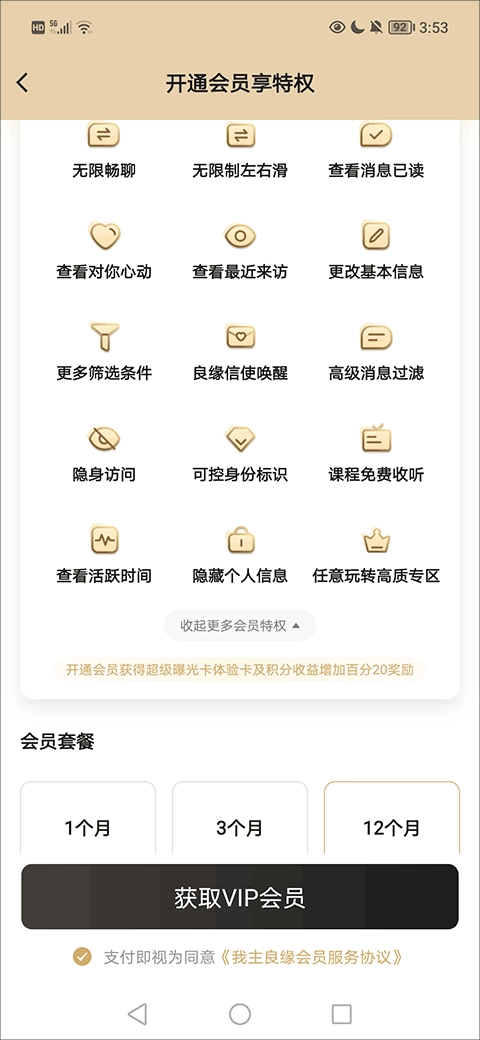 2. 在开通会员的界面里,找到“会员套餐时间”选项并点击,之后再点击“获取 VIP 会员”按钮。
