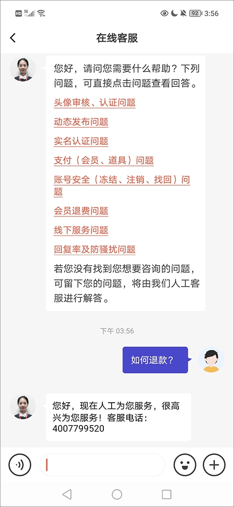 2、在在线客服界面能够找到会员退费问题,用户在此处还能直接输入“如何退款”,从而获取相关回答。