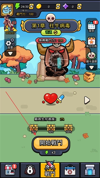 1、在第1章社牛病毒等关卡里,点击“开始战斗”进入战斗。