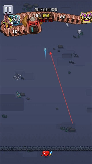 2、在战斗过程中,操控红色心脏发射药丸,去攻击位于上方的病毒。这些病毒会呈现出血量数值,你需要把它们的血量削减至0,如此便能成功击败病毒。