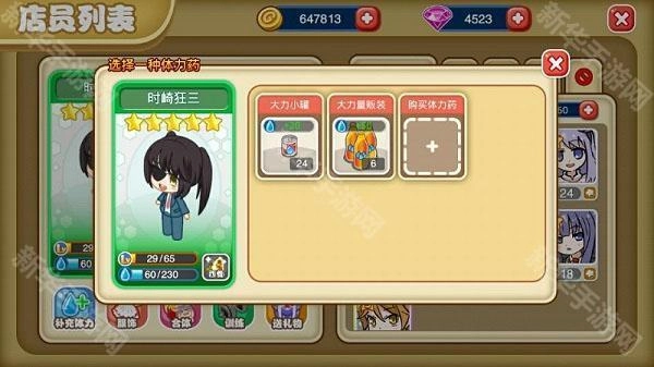 可单独查看每位店员的个人状态,若店员体力不足,可使用在商店购买的体力药水为其补充体力。