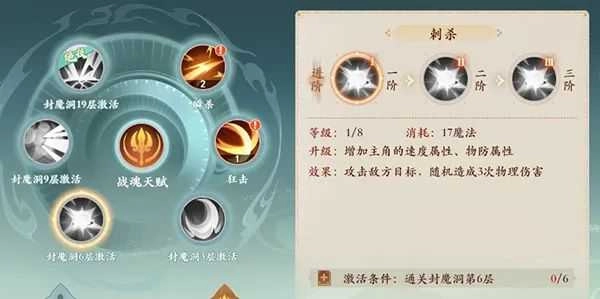 4技能:刺杀,对随机目标造成3次伤害。(二阶:刺杀时优先选择气血较少的目标,三阶:技能伤害结果提升10%)