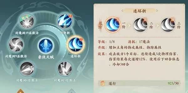 2技能:连环斩。此技能会对单体目标造成3次物理伤害,每次伤害结果递增12%。技能冷却时间为3回合,释放后需休息1回合。(技能提升至2阶时,技能伤害结果额外增加10%;提升至3阶时,技能伤害结果再额外增加10% )