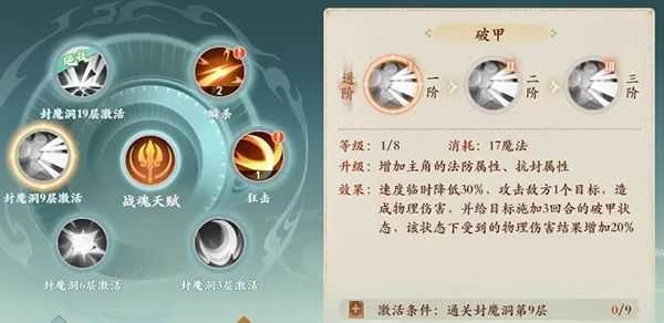 5技能:破甲。释放技能后,目标速度会临时降低30%,该速度降低效果在回合末清除。同时,目标会被施加破甲状态,持续3回合,处于破甲状态下,受到物理伤害的结果增加20%。(技能提升至2阶时,破甲状态的持续时间额外增加1回合;提升至3阶时,破甲状态下受到物理伤害的增伤效果额外增加10% )