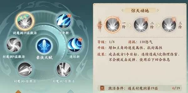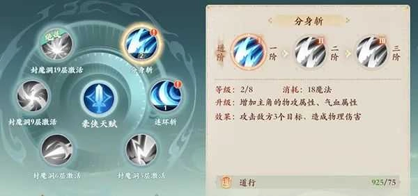 1技能为分身斩,可攻击群体3个目标。(提升至2阶时,目标数量增加1个;提升至3阶时,技能伤害结果额外提升10% )