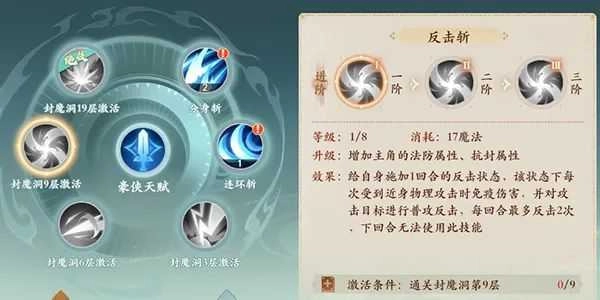 5技能:反击斩。使用后施加1回合的反击状态,在此期间,角色每次受到近身物理攻击时不仅能免疫伤害,还会以普通攻击进行反击,每回合最多可反击2次。该技能冷却时间为2回合。技能进阶效果如下:2阶时,反击次数增加1次;3阶时,技能伤害结果额外提升10% 。