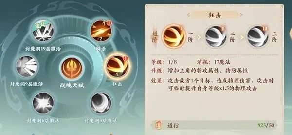 2技能:狂击,对1个目标发起攻击,可临时提升等级*1.5的物理攻击力。(技能提升至2阶时,伤害结果增加10%;提升至3阶时,伤害结果再增加10% )