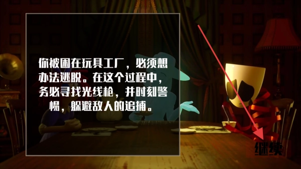 2. 进入游戏之后,仔细阅读提示信息,接着点击“继续”按钮,全面了解游戏规则以及任务目标,比如寻找光线枪、躲避敌人的追捕等等,从而为顺利开展游戏做好充分准备。