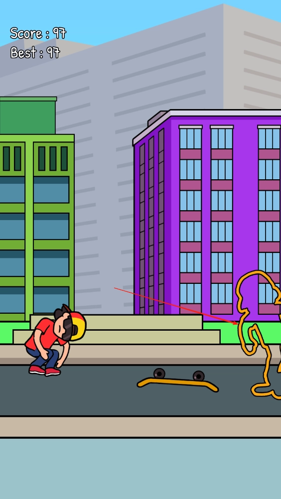 3、骑行至后半程,依据轮廓做出摆动滑板的姿势,点击屏幕使角色控制成相同姿势,接着继续向前行进就可以了。