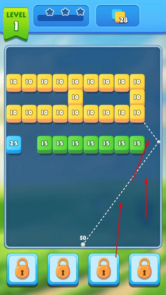 1. 在 LEVEL1 关卡里,借助调整发射角度,让小球发射出去撞击标有数字的方块。