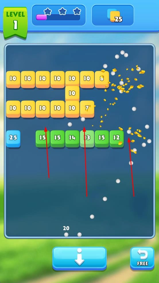 2、方块上的数字会逐渐减少,当数字减至0时,方块便会消失,与此同时,玩家会获得相应分数,屏幕上方还会显示星级评价的进度。
