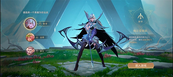 2、进入游戏后,第一步要做的是挑选英雄。可供选择的英雄类型有三种,分别为射手、战士和法师。我们先选择射手,随后点击进入游戏。