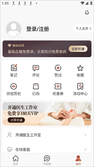 1. 开启软件,登录完毕后进入个人中心界面,开通医生工作室,就能免费获得180天的vip会员资格。