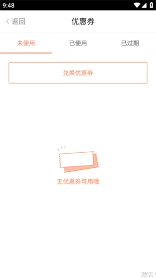 3、进入优惠券页面,你就可以看到未使用、已使用以及已过期的优惠券。