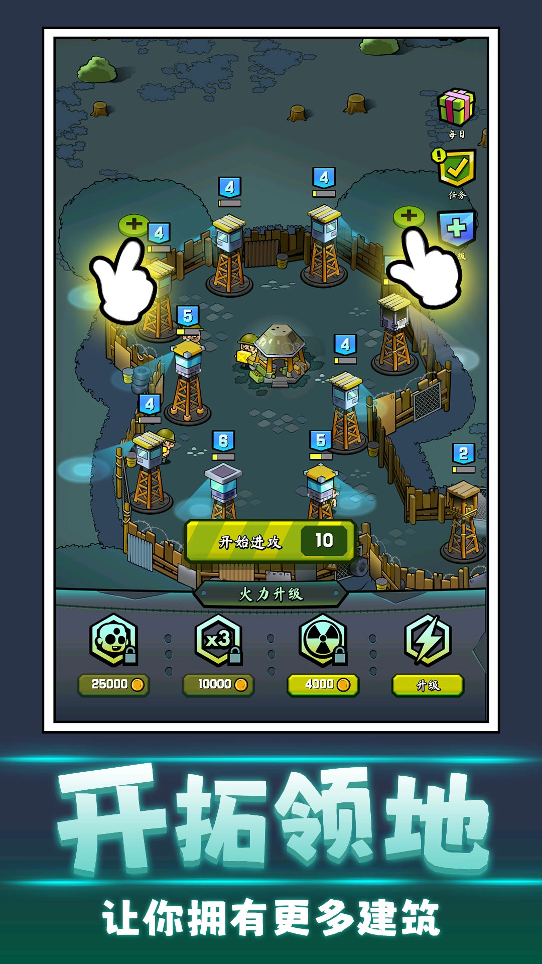 搭建不同功能的防御设施,像远程攻击塔和重型火炮塔,来抵御不断涌现的丧尸敌人。