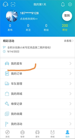 1、打开并登入,进入我的页面点击“我的爱车”。
