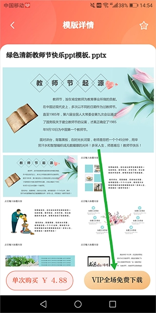 你还能径直进入模板详细页面,点击页面底部右下角的【VIP全场免费】按钮。