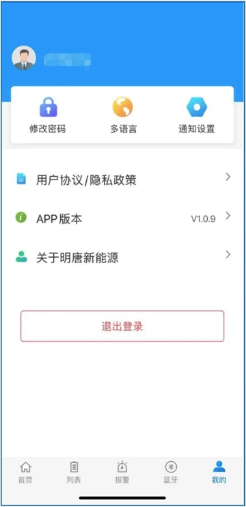 个人中心集成了修改密码、语言选择、通知设置、用户协议查看以及退出登录等功能模块。