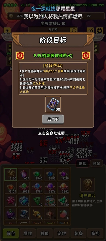 接下来可以开启自动模式跟着引导流程推进,通关时一定要选高阶重置(前期核心道具获取难度很高,而特殊货币看广告保底能拿到不少,更别提特定充值能获得大量储备,广告获取的阶段是暂时的,建议好好把握)记得加入官方社群输入福利码领取强力初始装备!!!重置后可以暂时退出游戏放松一下(开玩笑的),因为需要多次重置才能解锁更高挑战难度,即使关闭游戏系统也会按你最快通关记录自动完成后续循环(这个设计还挺贴心)。回来后用核心道具兑换新手必备的装备道具就好。