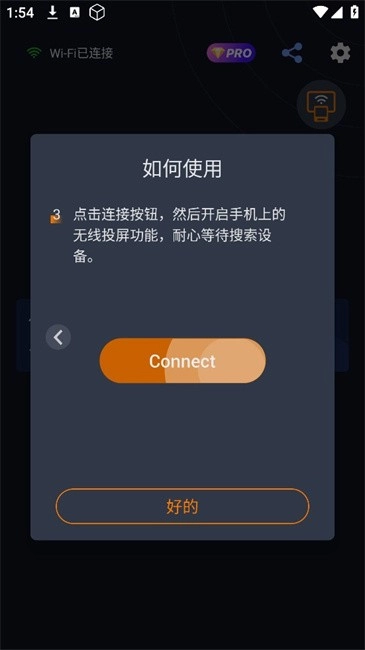 点击连接按钮后,再打开手机的无线投屏功能,然后耐心等待设备搜索完成。