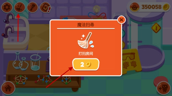 点击左上角的图标,就能消耗金币来打扫房间,把散落的物品重新整理好。