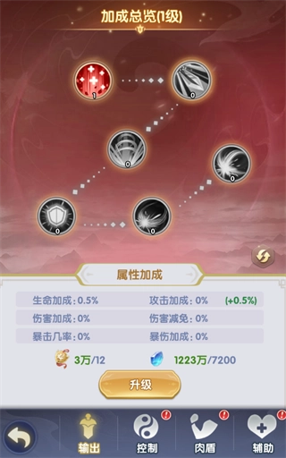 宗门弟子可消耗宗门贡献或灵石,分别提升输出、控制、肉盾、辅助四大职业的各项技能属性。