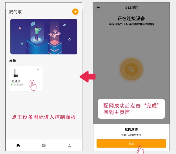 设备会自动启动连接流程,待配网成功后该流程结束;返回主页即意味着设备绑定完成,点击对应图标即可进入控制界面。