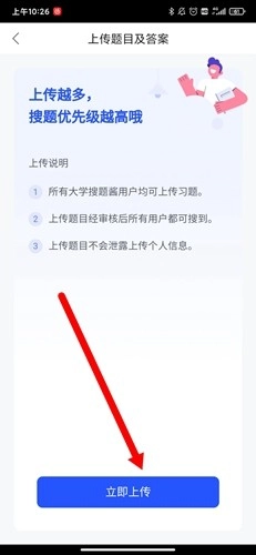 接下来在新打开的界面里,阅读并了解上传题目的好处,等清楚了解之后,我们就点击下方的【上传】按钮。