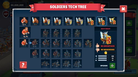 第二是用于优化兵种发展方向,可供选择的兵种类型丰富多样,像骑兵、盾兵、剑士和攻城车都在其中。