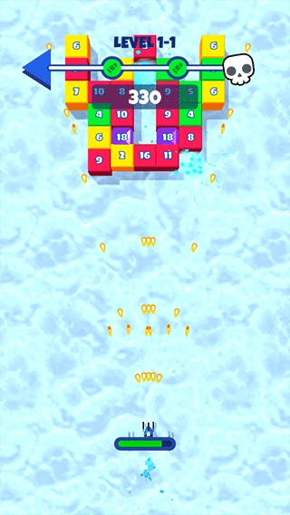 每个冰块上的数字会随着被击中次数减少,等冰块完全碎裂后,就会掉落金币和道具,要是能及时捡起来,就能帮助提升射击能力和生存能力。