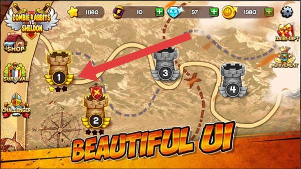 在关卡地图界面,点击标注为【1】的关卡入口,即可进入战斗场景。进入后需合理布置防御设施,全力抵御僵尸兔的一波波进攻,目标是达成三星评价顺利通关。