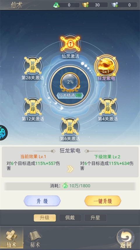 通过升级仙术能够增强自身的各项属性,进而提升战斗能力(需要注意的是:仙术的等级不能高于自身当前的等级)。