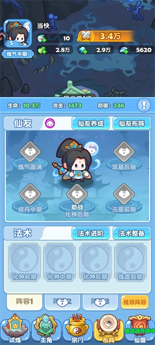 合理搭配跨境界仙友阵容(推荐元婴+化神组合),注意法术进阶与防御属性(生命10.3万/防御246)平衡发展。