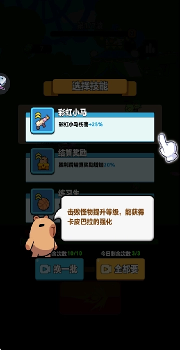 获得的奖励既能用于提升卡皮巴拉的等级,也能用来升级彩虹小马以增强其攻击伤害。
