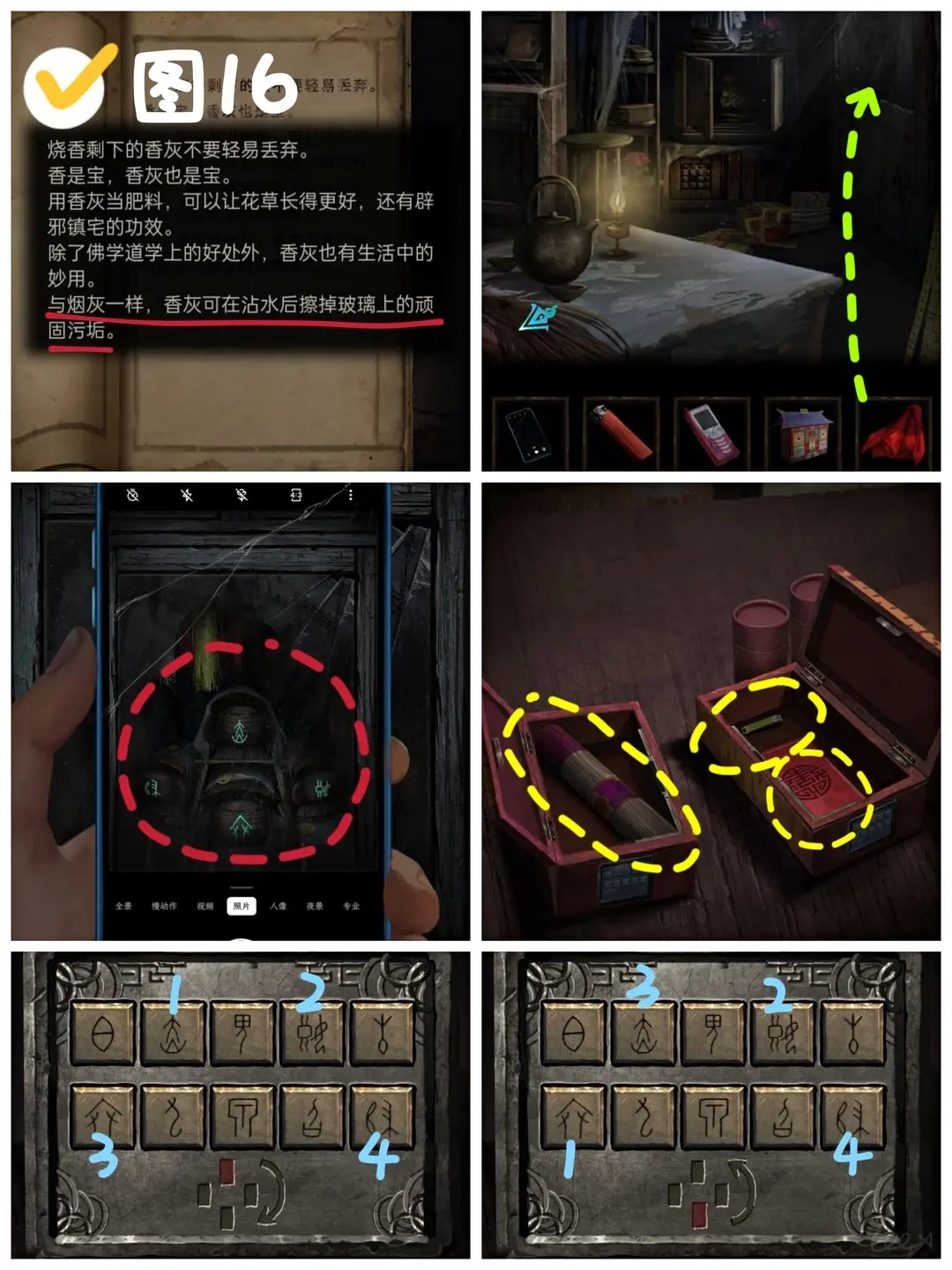进入易寿堂后,先取浸水盖头擦拭右侧玻璃,待玻璃洁净后用手机对准它,接着留意棺材上的字符。之后前往婚庆用品店,依据棺材字符与桌上红盒符号方向的对应关系,解开两个盒子的锁;从左边盒子里取出一捆香,右边盒子中拿到指甲刀,再翻开红皮书第二页获取空白符纸。(图16)