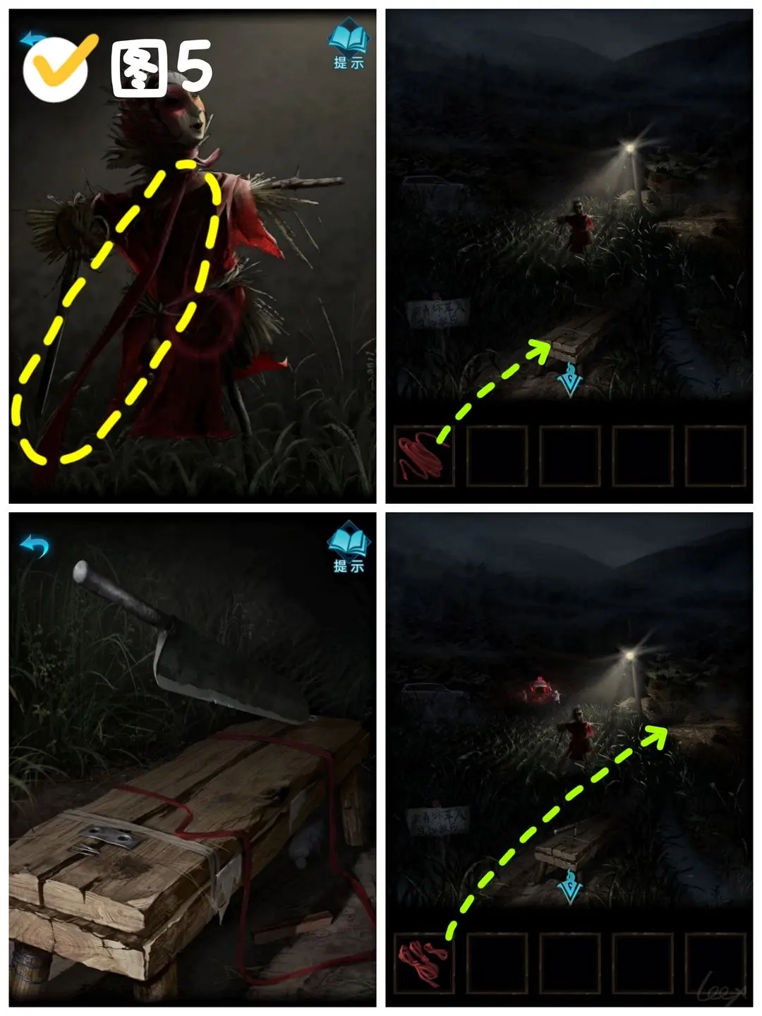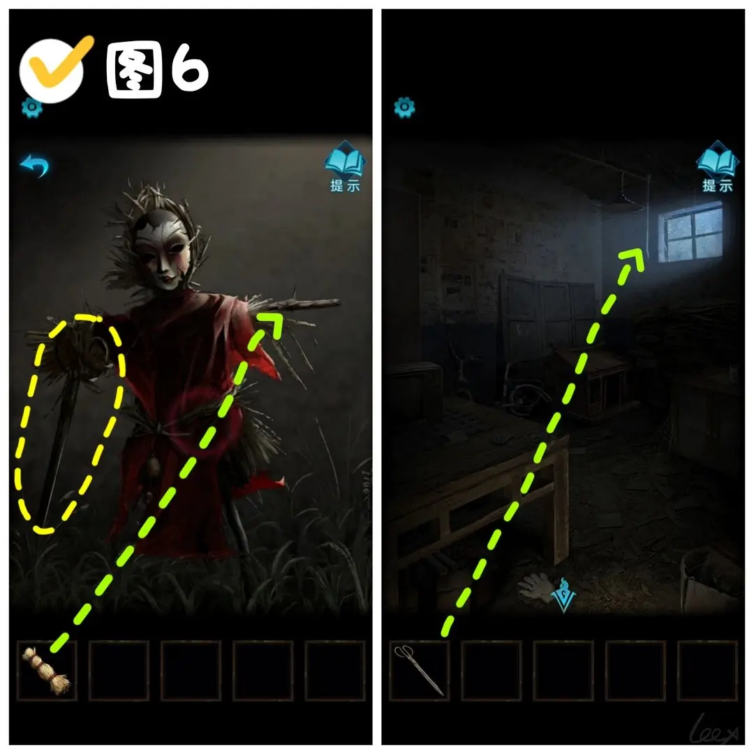 把一捆稻草装到稻草人身上,把稻草人修好后能得到〔火钳〕。之后回到院子里,走进门口的库房,用得到的火钳去操作灯绳,就能把灯打开了。(图6)