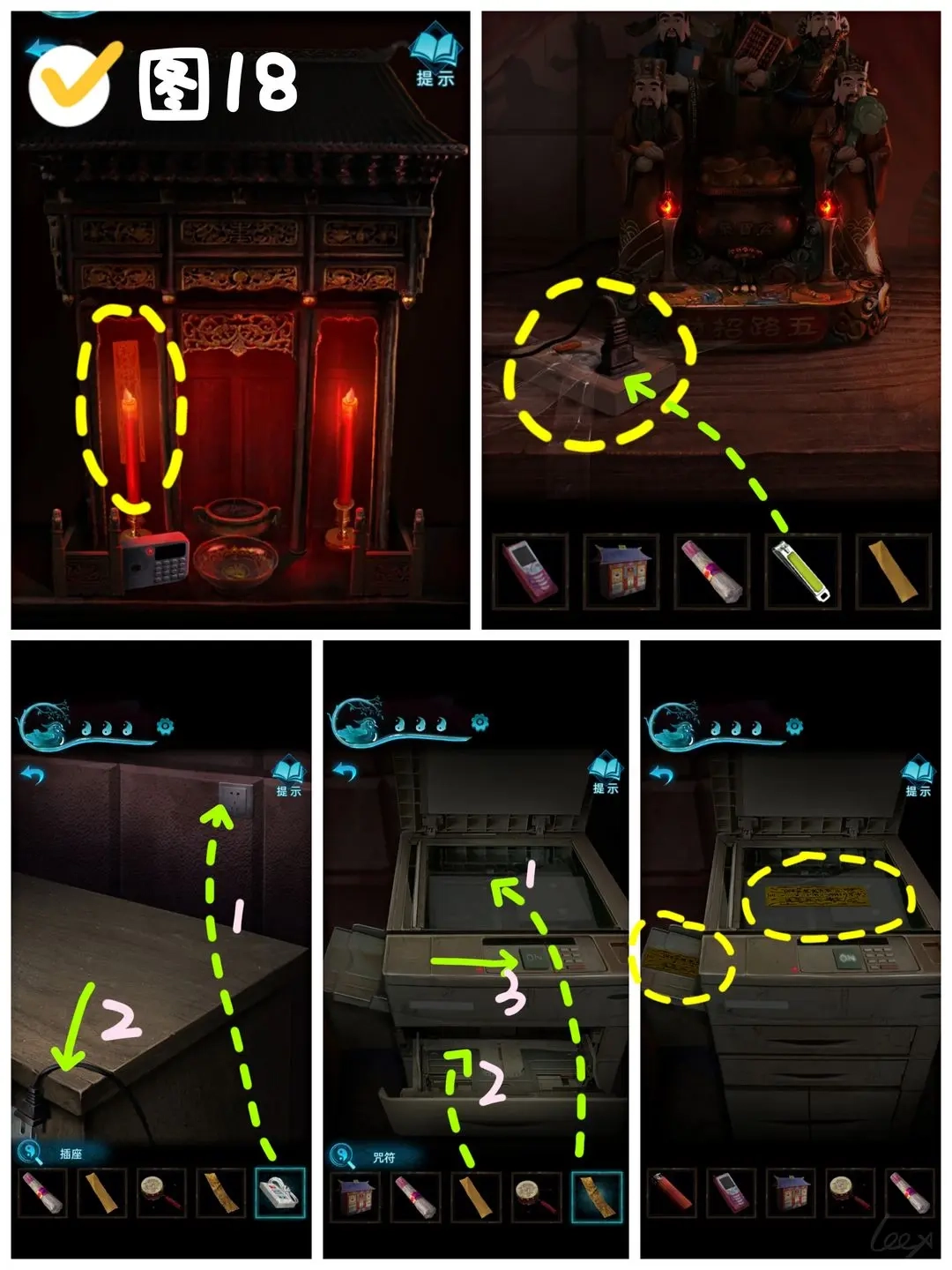 在六宝阁里,开启3号开关后,找到左边的神龛,取走那里的咒符。走到外面,用指甲刀划开桌上的透明胶,取下插座。进入婚庆用品店,找到收银台,把插座接到电源上,再把复印机的插头插好。操作复印机时,把咒符放在扫描区域,空白符纸放进下方纸盒,按下ON开关,等复印好后,取走两张新的咒符。(图18)