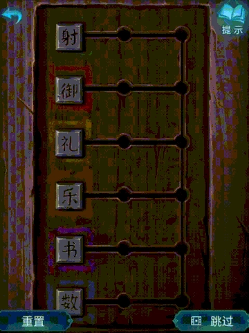 走到大门右侧,点击那个水壶,拧开盖子后把香灰倒进去,这样就能得到〔香灰水〕了。接着把香灰水倒进桌上的茶杯里,留意茶杯上浮现的字和它们对应的颜色——“紫御、橙数、黄书、红射、蓝乐、绿礼”,再依据这条线索去解开桌子右边的箱子,就能拿到里面的〔钥匙〕。