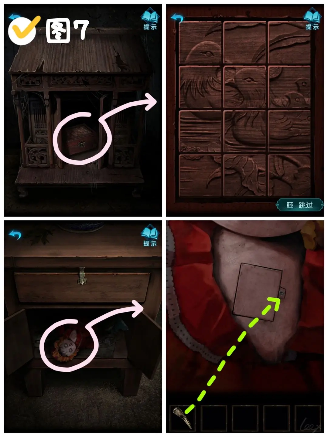 点击库房角落附近的小神龛,接着点击神龛里的盒子并完成拼图,即可获取〔铜指甲〕。随后离开库房,返回大门左侧的屋子,打开供桌左侧下方的柜子,会出现一个娃娃,用铜指甲拧开娃娃身上的螺丝,就能拿到〔电池〕。(图7)