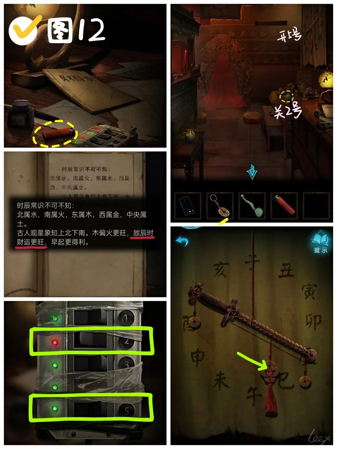 右转进入六宝阁,在右侧的桌子上找到〔打火机〕,并阅读《风水民俗小知识》。接着关闭2号开关,从元宝模型上取下夜光的〔小元宝〕。之后打开5号开关,点击查看右上角灯下的铜钱剑,把吊坠挂到剑的右端;依据《风水民俗小知识》第二页提到的“辰时财运更旺”,移动剑中间的大吊坠,让剑的右端指向“辰”的方位,此时卷轴会打开,从中获取〔小金鞭〕。(图12)