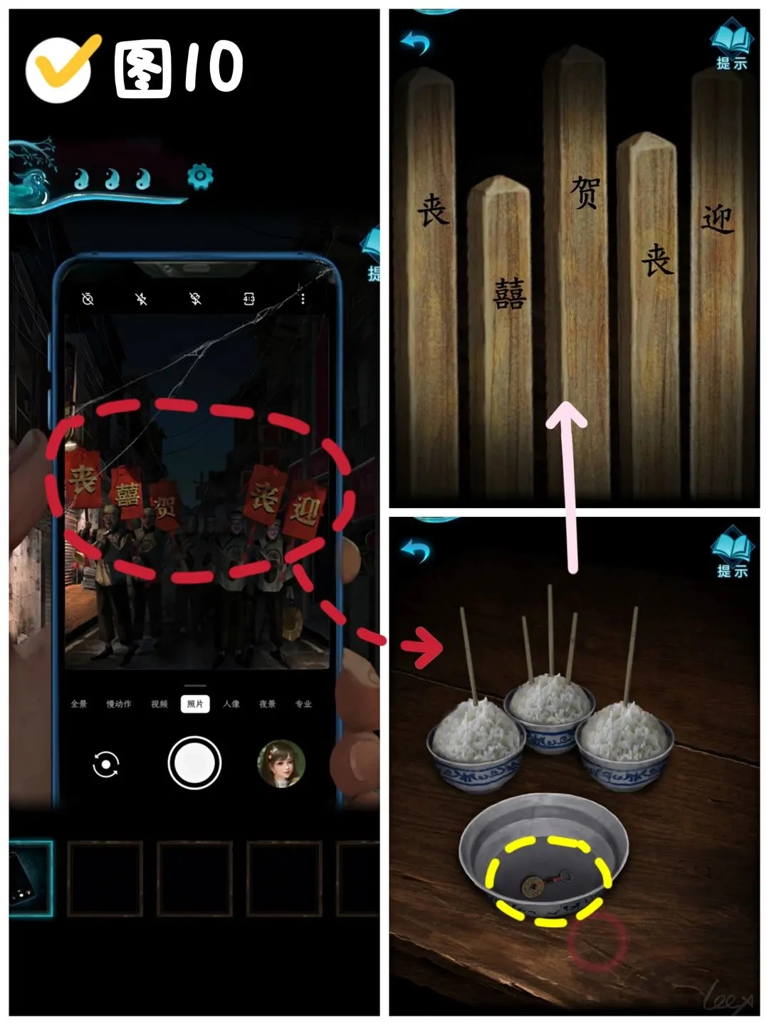 看纸人手里举着的牌子,上面写着“丧-囍-贺-丧-迎”,右转走到月老所在的地方,点击右边的桌子,按照纸人举的牌子调整米饭上筷子的方向,等黑汤完全喝完,就能从碗里拿到〔吊坠〕了。(图10)