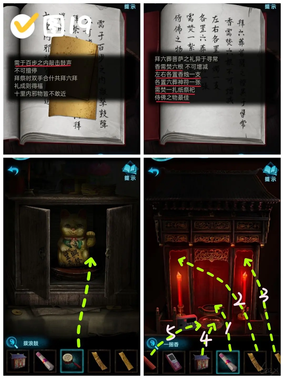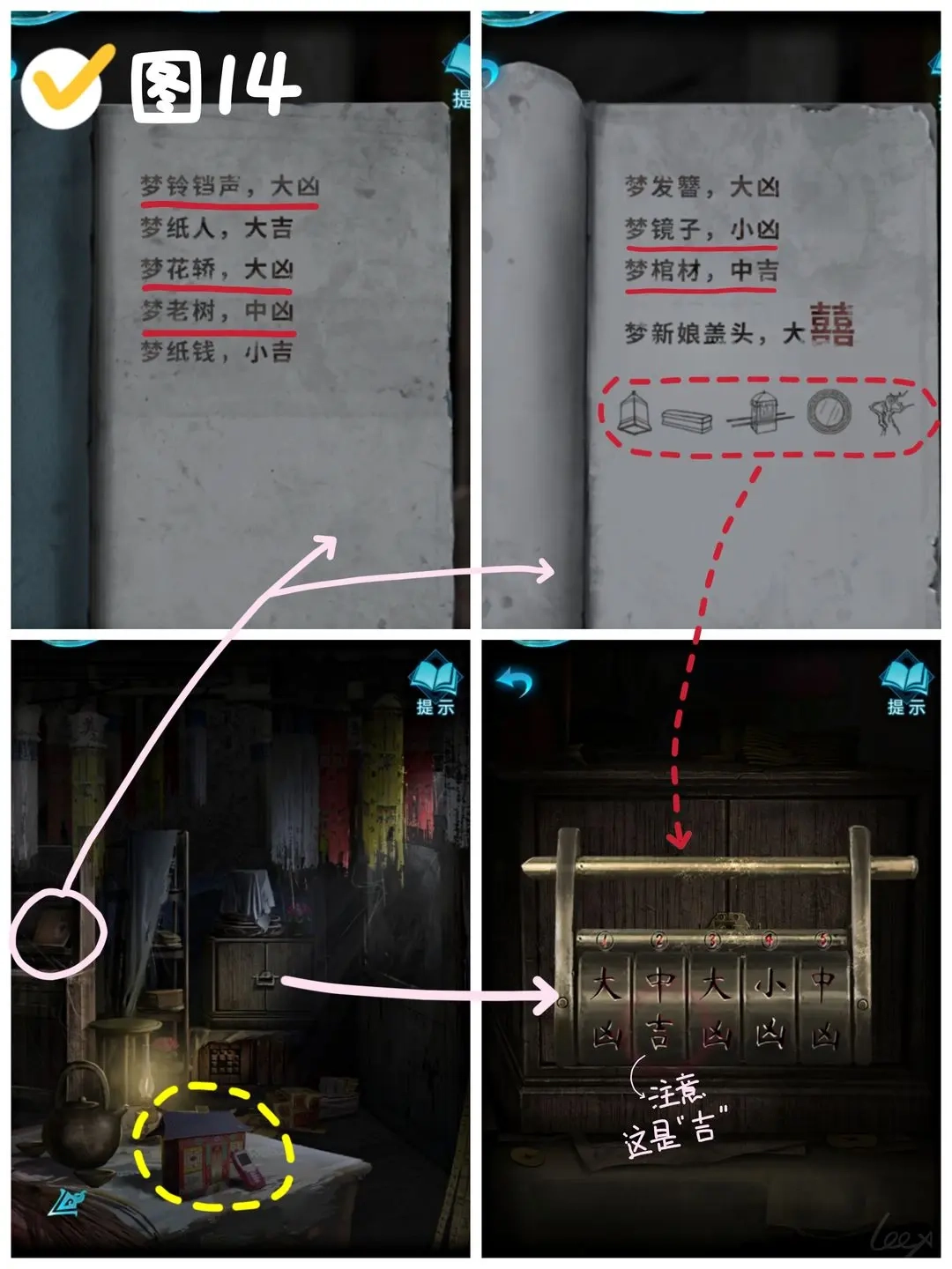 踏入易寿堂的空间后,先取走桌案上摆放的纸扎通讯设备与纸扎庙宇模型。接着查看左侧置物架上的《解梦》典籍,依据典籍第二页的符号提示,结合前后页的吉凶标注来右侧立柜的密码——其中“铜铃、棺木、喜轿、铜镜、灰鼠”分别对应“极凶、次吉、极凶、微凶、次凶”的预兆序列。完成解锁后,从柜内取出一面小巧的旌旗。(参照图14)