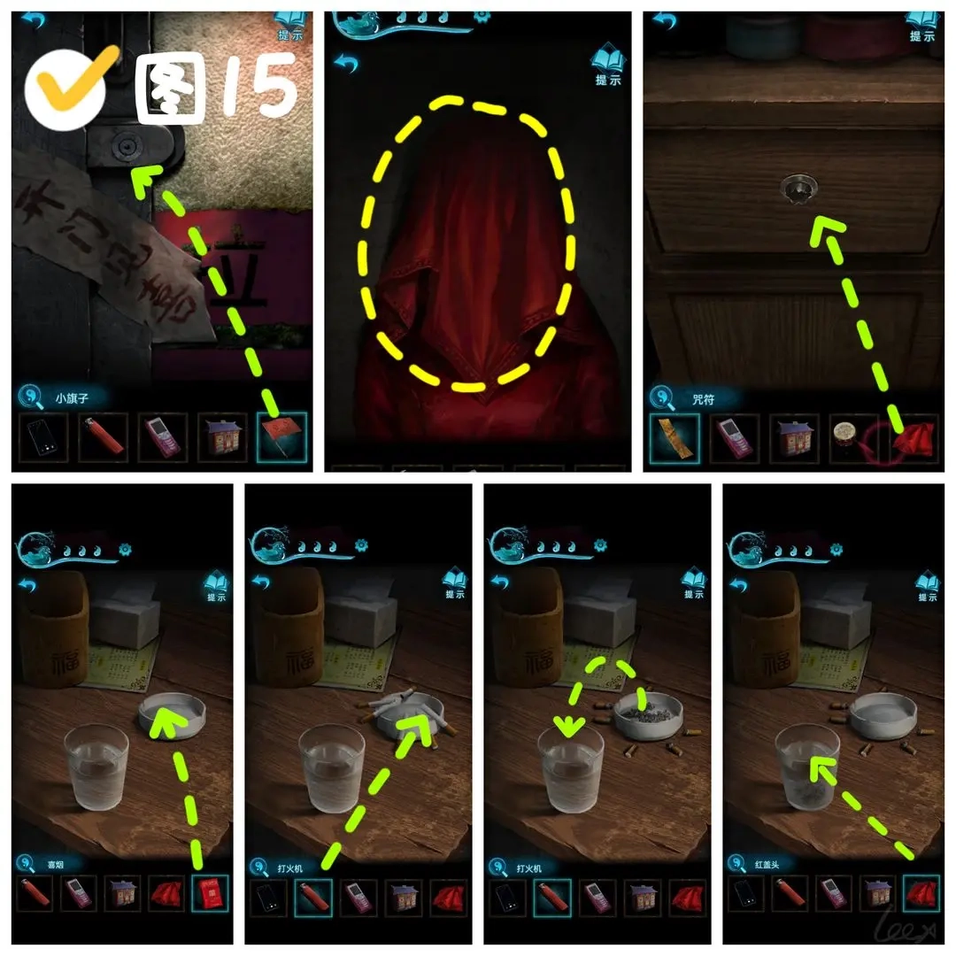 用小旗子解锁月老近旁的门扉,步入婚庆商品铺。取下房间角落模型上的红色头巾,将其用于右侧柜橱的抽屉,开启抽屉后获取喜烟。依据《风水民俗小常识》首页内容,烟灰水能够清除顽固污渍,于是离开婚庆商品铺,点击左边的桌子,把香烟放置在烟灰缸上,再用打火机点燃。稍作后退,推进剧情。再次点击左边的桌子,香烟已燃尽,点击烟灰缸将烟灰倒入水中,随后把红色头巾放入烟灰水中,得到浸湿的头巾。(图15)
