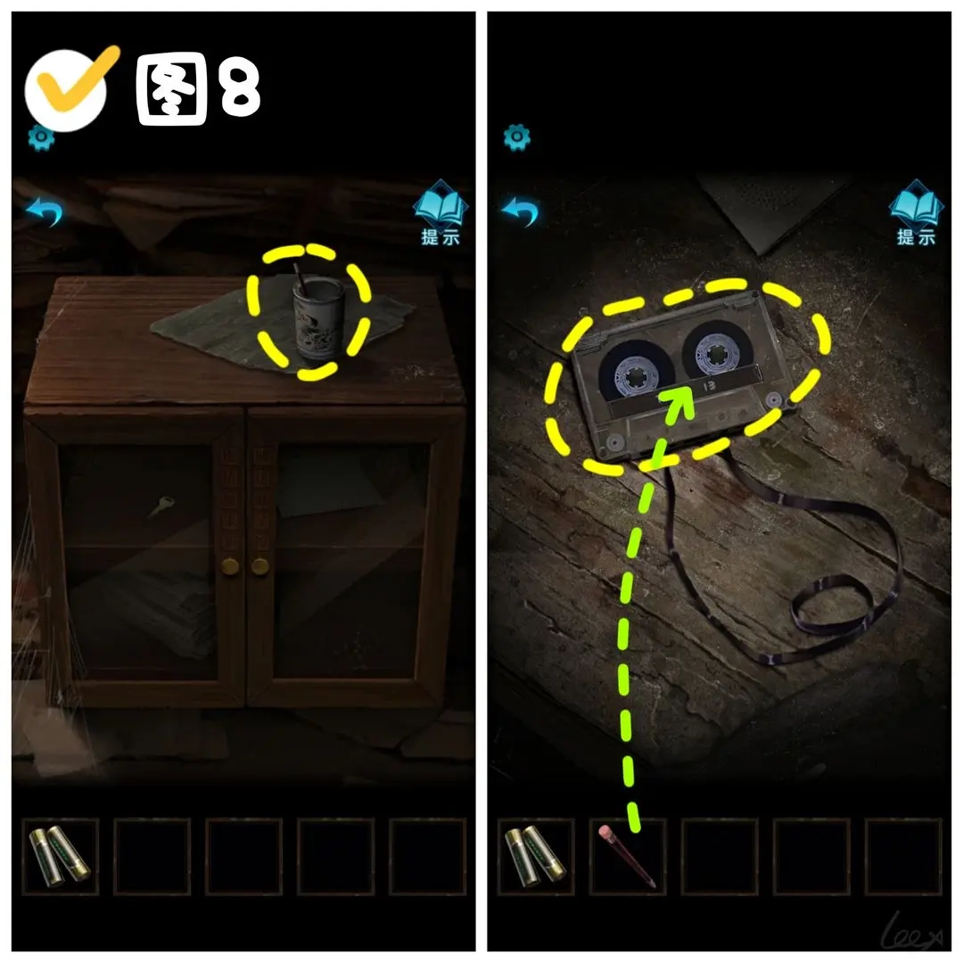 返回库房后,取走右侧柜子笔筒里的铅笔。接着点击左侧桌上的磁带,用铅笔修复它,就能得到修复好的磁带。(图8)