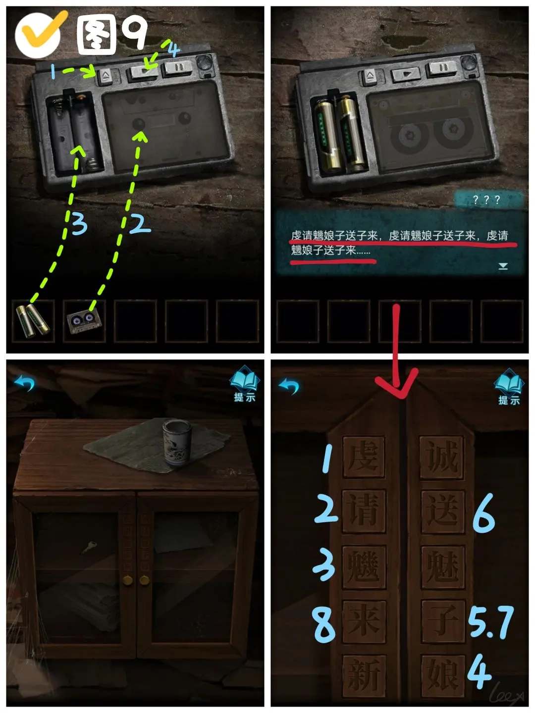 操作桌上的便携音频设备,先按最左边的按钮掀开仓盖,放入磁带并装好电池,再按左数第二个按钮启动播放,留意播放时弹出窗口里的内容——“虔请魕娘子送子来”(若没听清可重复按该按钮重放)。之后根据这段内容解锁右侧柜子:按顺序点击柜上对应的文字,解锁后打开柜子就能拿到钥匙。(图9)