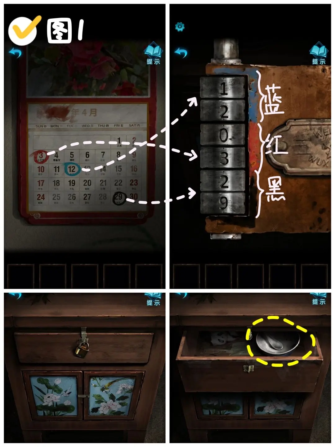 观察左侧墙壁上的日历,留意并记住那三个被圈起来的日期以及它们各自对应的颜色,具体是“红3 - 蓝12 - 黑29”。接着,依据日历所提供的线索去解锁日历下方柜子上的抽屉。要特别注意锁上的颜色顺序,从上到下依次为“蓝 - 红 - 黑”。按照这个颜色顺序对相应的日期进行排列,就能得到密码“12 - 03 - 29”。输入密码打开抽屉后,就可以拿到〔寿碗〕了。(图1)