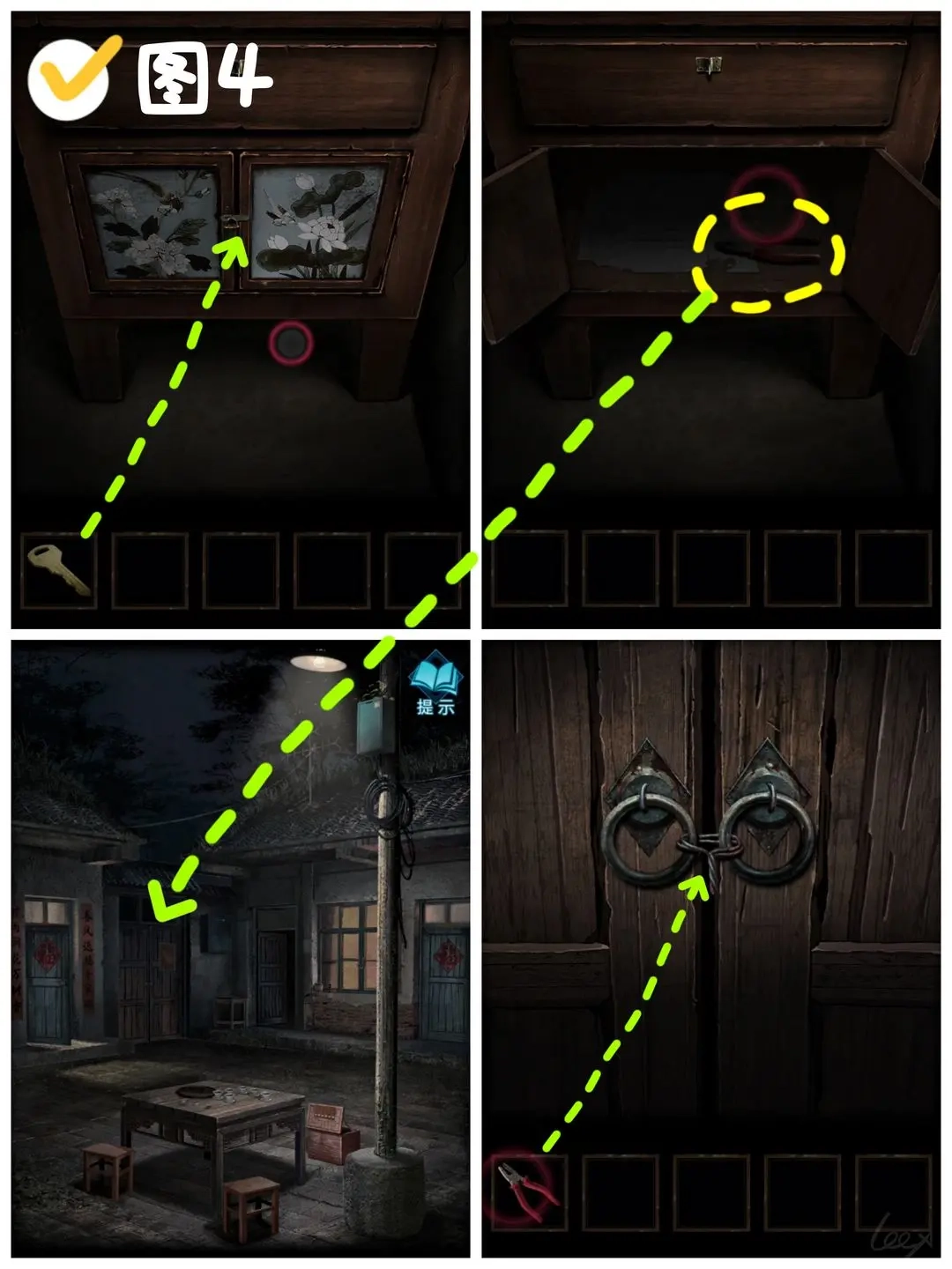 回到屋内,用钥匙打开供桌右侧下方的柜子,取到〔钳子〕。随后前往院子,用钳子拧开大门上的铁丝,走出院门来到院外。(图4)