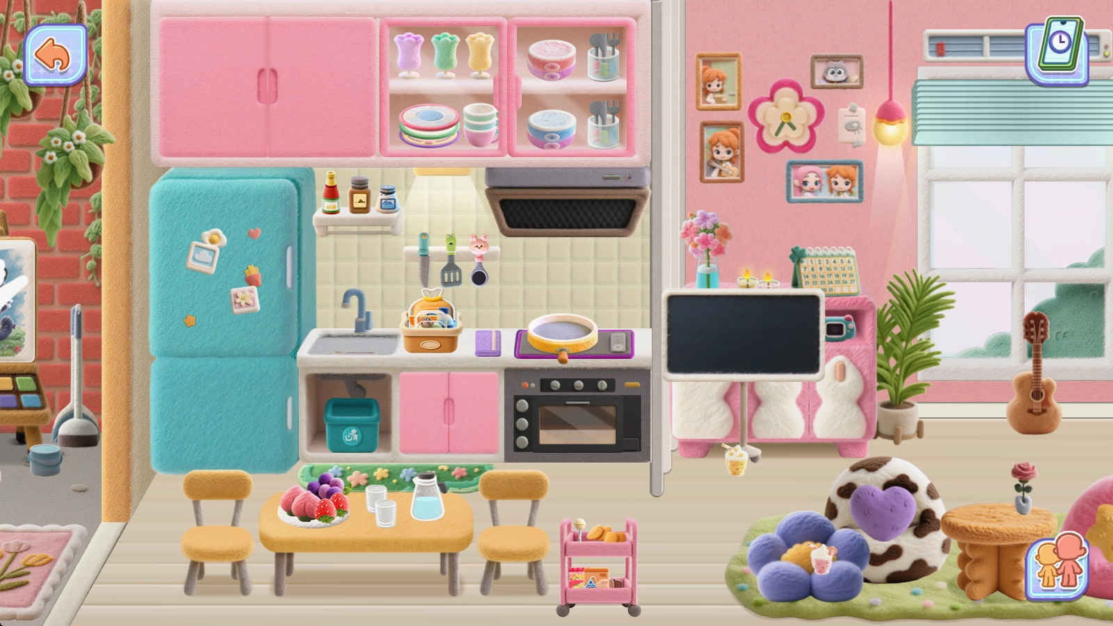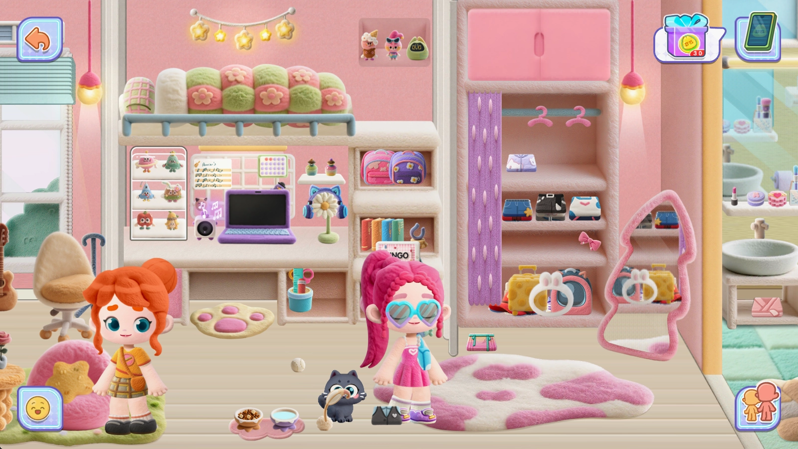 游戏配备了模块化建造功能,玩家能够随意拖拽道具布置家具、挑选壁纸、组合摆件,从复古风格的壁纸到软萌可爱的地毯,每个细节都可以进行定制。