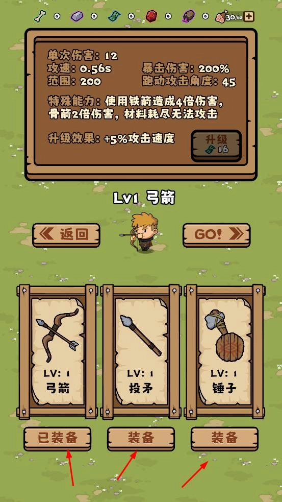 挑选武器时,可选择装备弓箭(单次伤害12、攻击速度0.56秒),使用铁箭能造成4倍伤害,骨箭则是2倍伤害;此外还有投矛、锤子等武器可供选择。同时,还能通过升级武器来提升攻击速度,从而增强战斗能力。